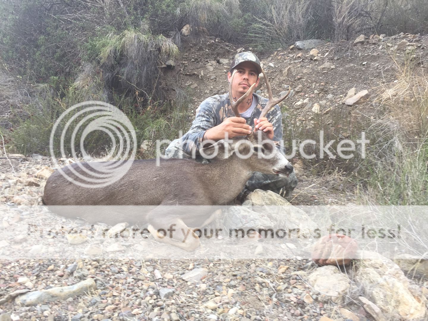 We make it, glassing the last spot we saw him and not seeing the buck. I turn to my bro and said let's sit and wait. And as soon as I start to take my pack off I spot the buck at 80 yards in the thick. I hiss there he is! STAND UP AND SHOOT HIM! But the buck starts to run. I whistled and whistled, but he kept going. So I grunt and dead stop. I range him and told my bro 103. Put the crosshairs on him and shoot him. Boom, thwack and he's drops. But he stands up and I said hit him again.....BOOM! And thwack another hit. After that he was done. We pack up and make the rest of the climb down, as we went, we looked across and noticed that his buck was killed no more than 100 yards from my buck.